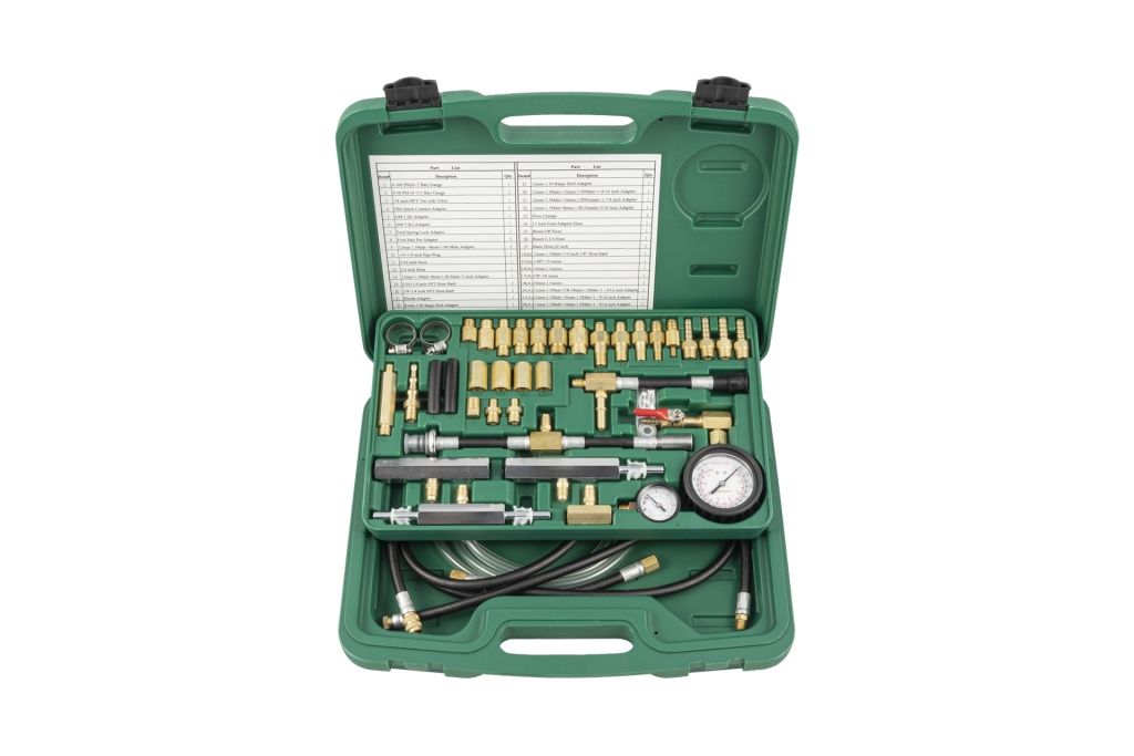 być używany do większości typów układów wtryskowych. Zestaw zawiera komplet końcówek, przewodów oraz dwa manometry (0-3.5 Bar i 0-7 Bar).