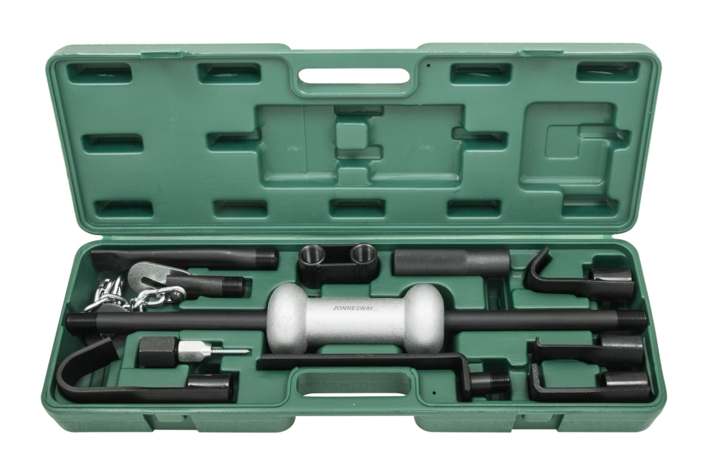 Ściągacz wyposażony jest w młotek bezwładnościowy 3 kg oraz zestaw adapterów do prac blacharskich.